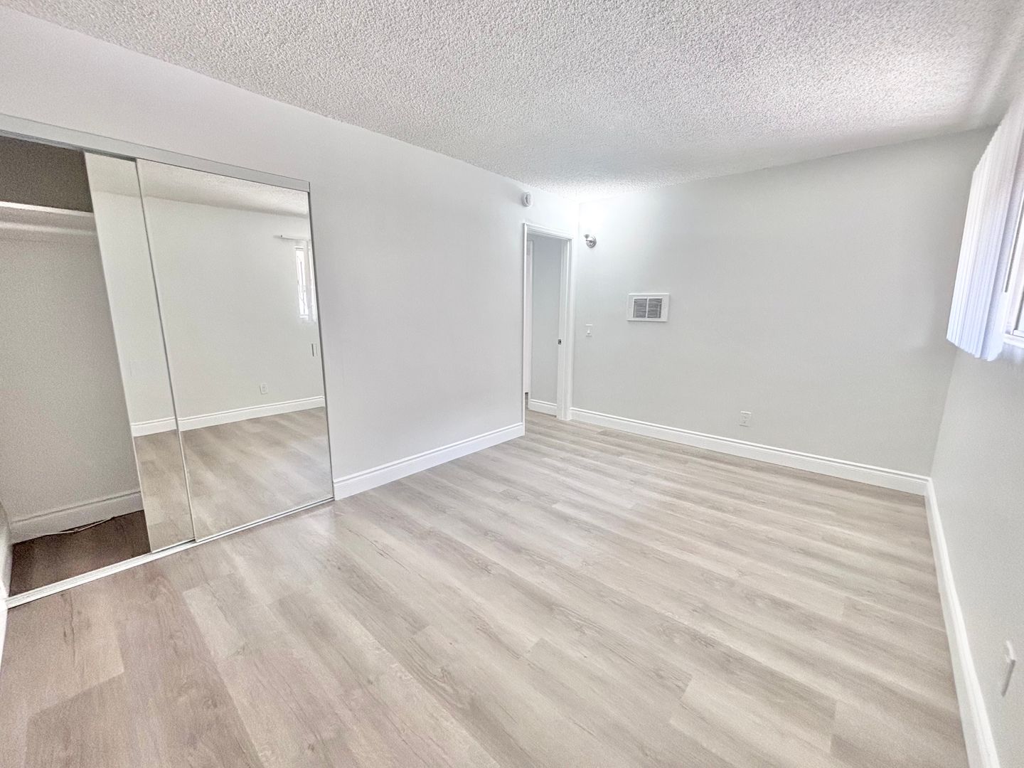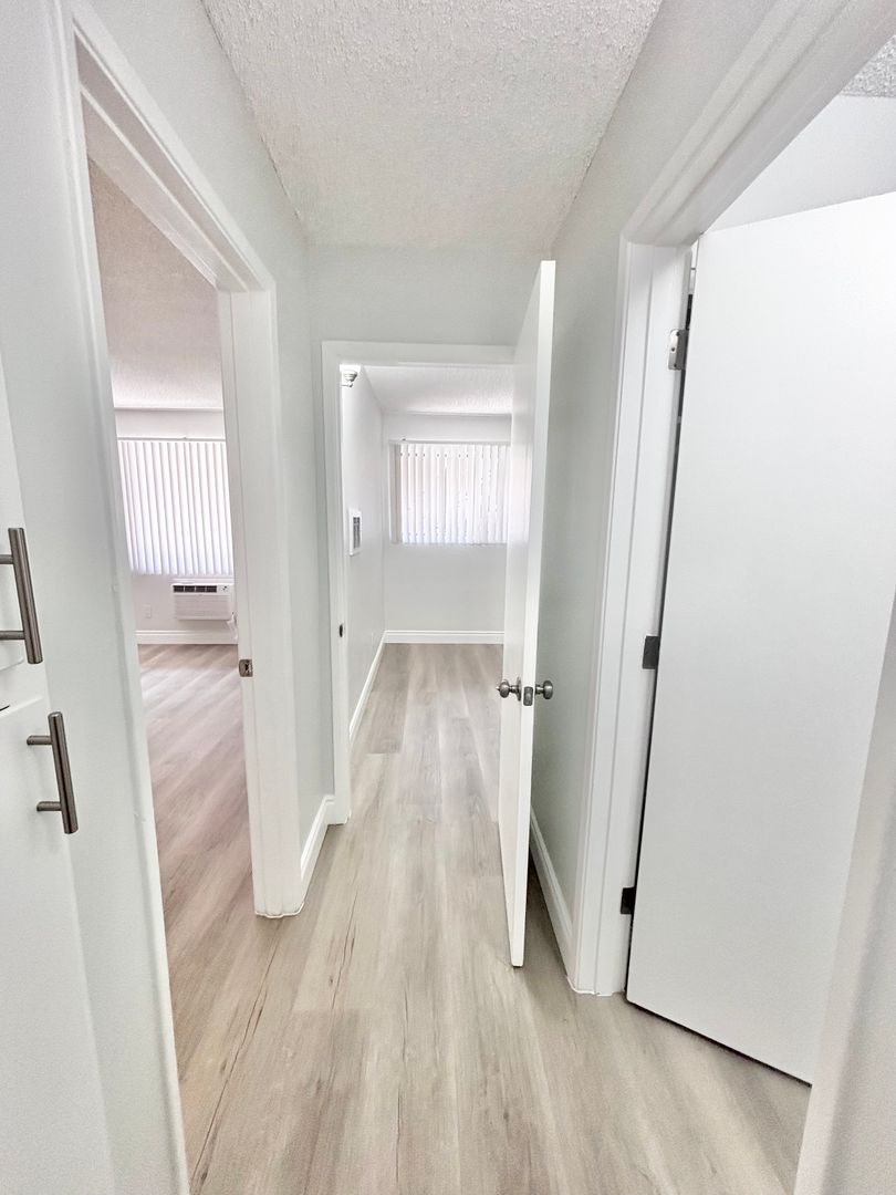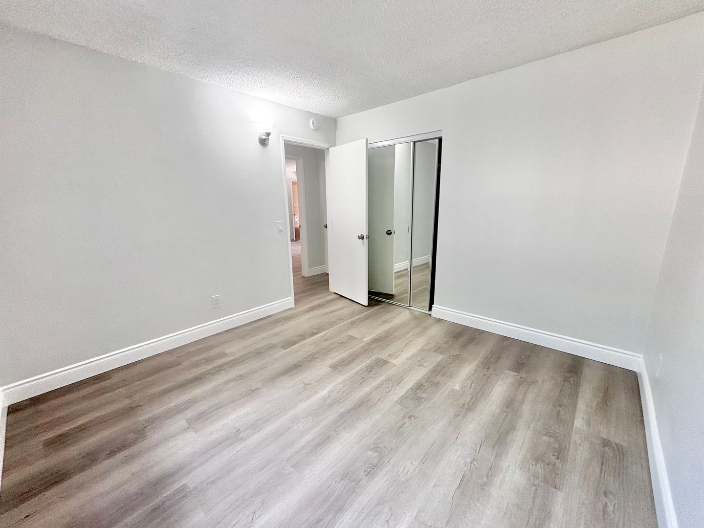 Both bedrooms are well-sized and include large mirrored closets, while the hallway offers floor-to-ceiling built-in storage for added convenience.