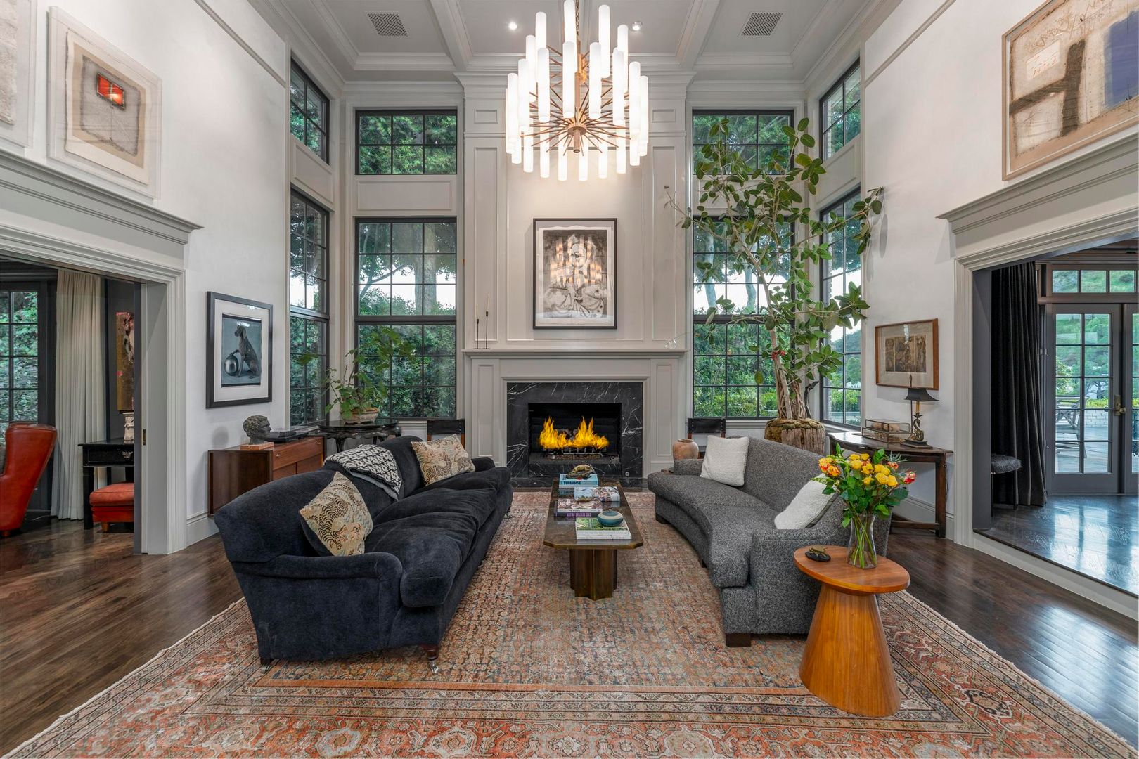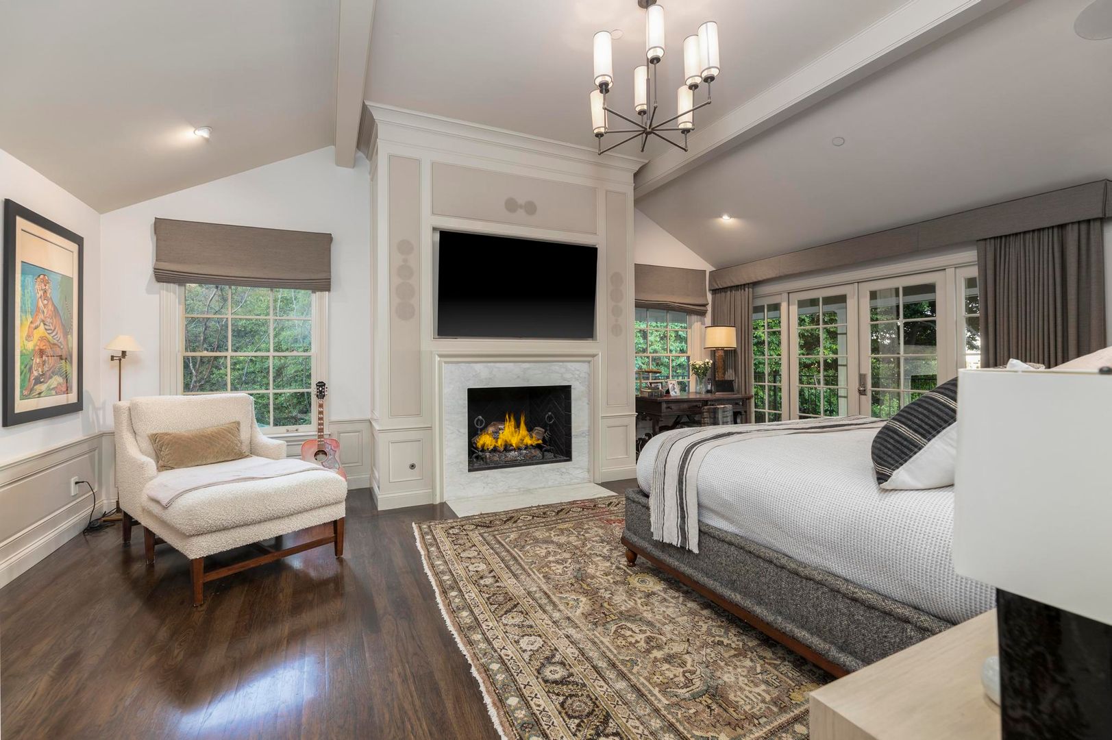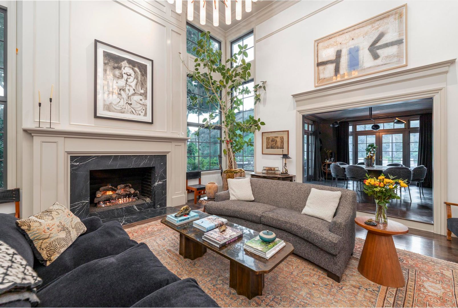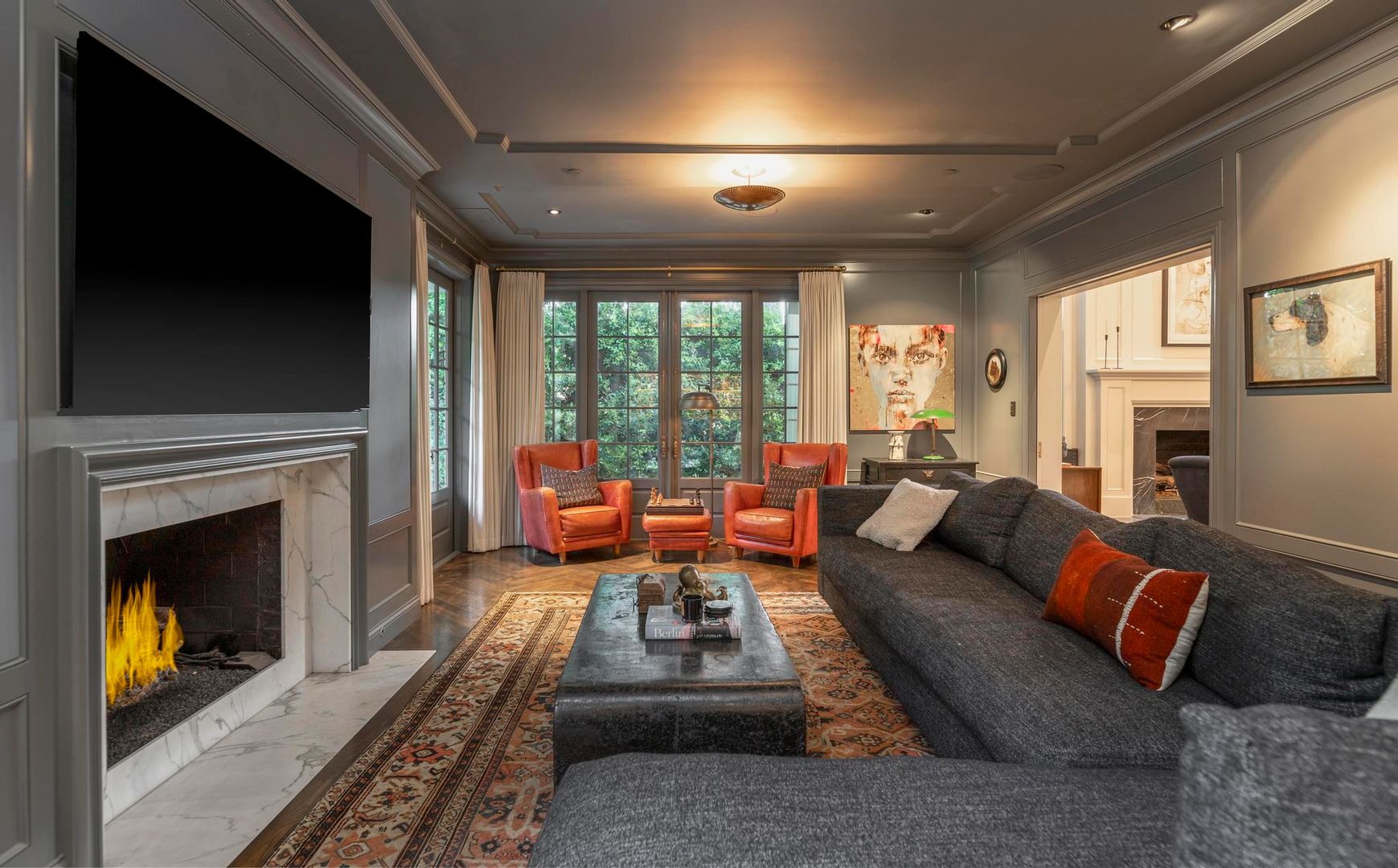 The home is offered fully furnished with high-end finishes and thoughtfully curated interiors. The main level features a chef’s kitchen equipped with premium Miele appliances, including three dishwashers and a built-in espresso machine. A grand formal living room with an oversized fireplace and expansive windows flows seamlessly into a full bar and screening room, along with a private office, dining area, and gym.