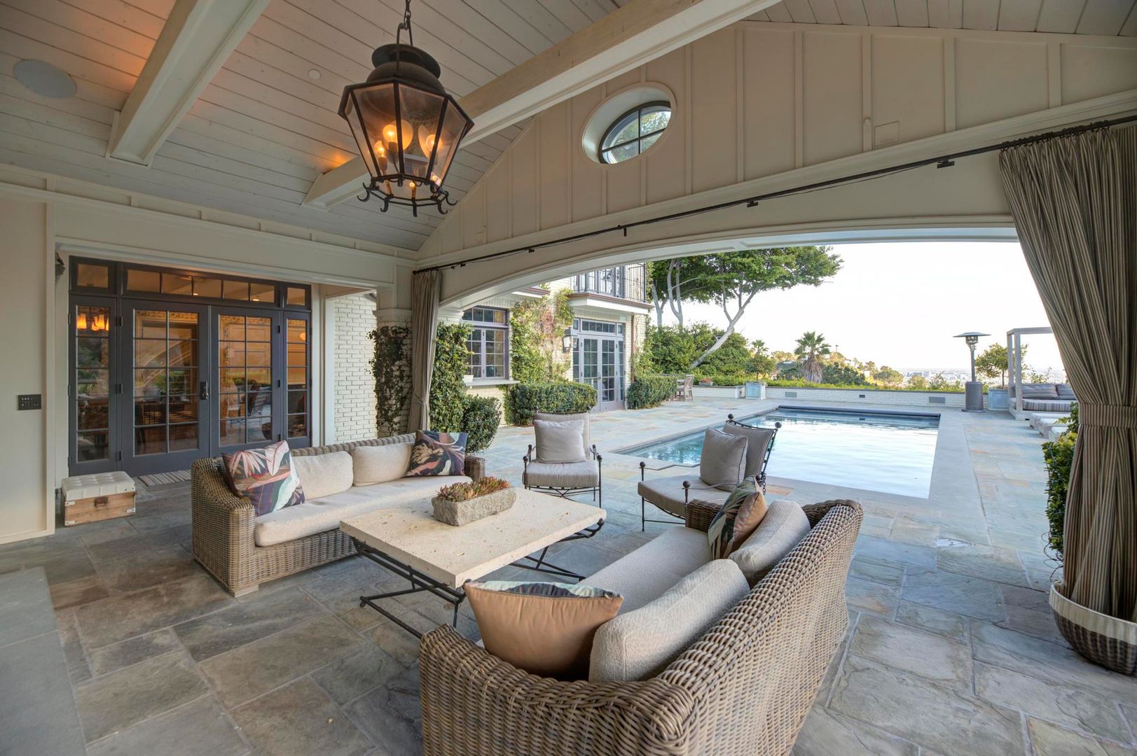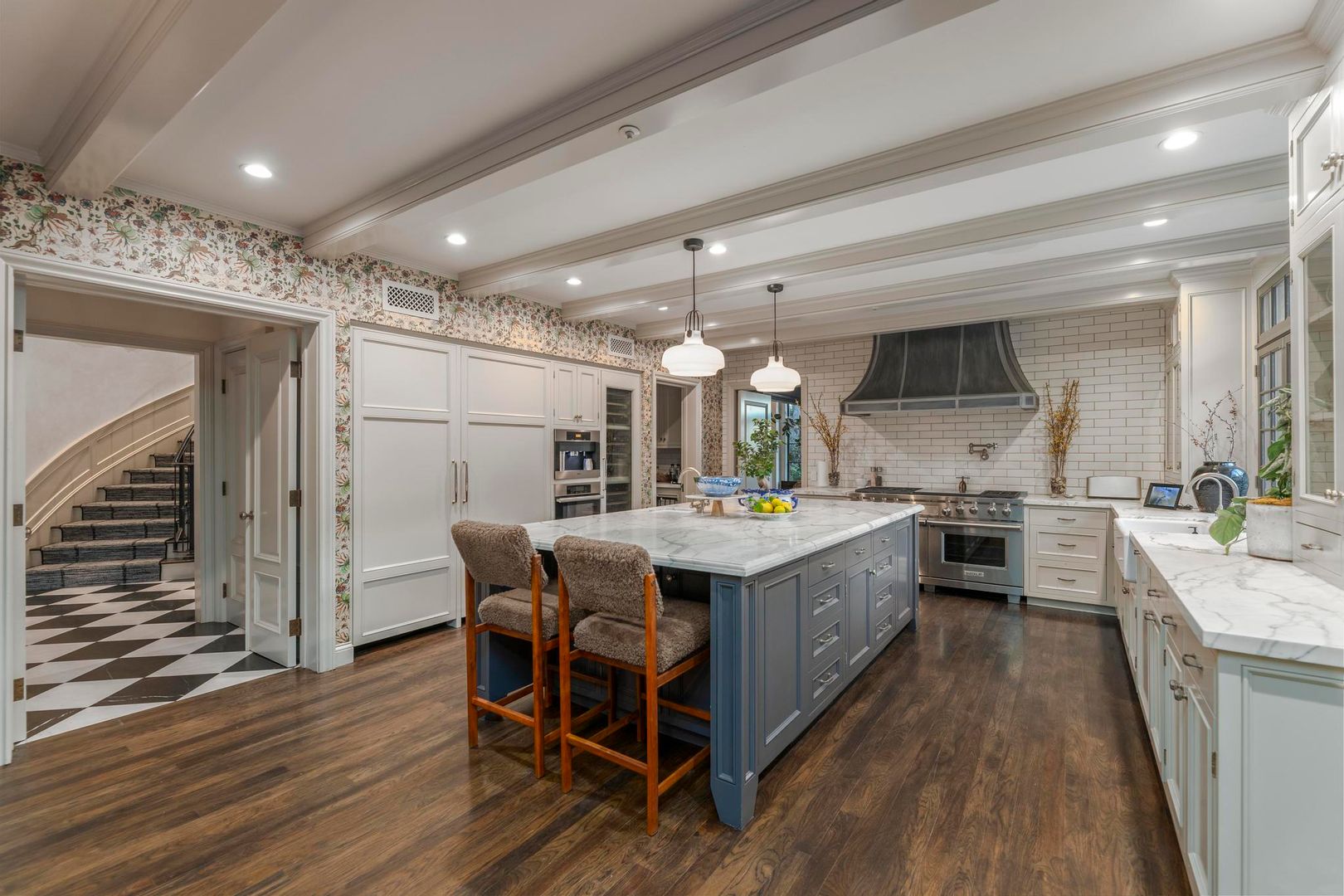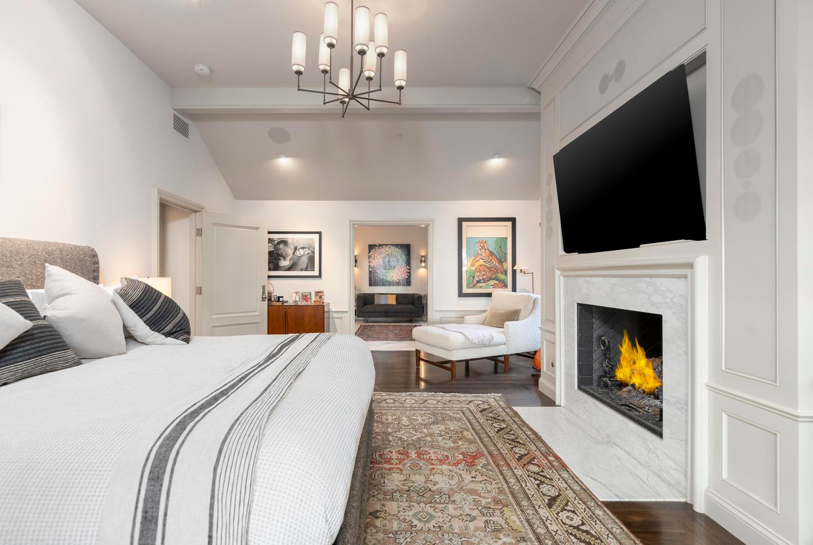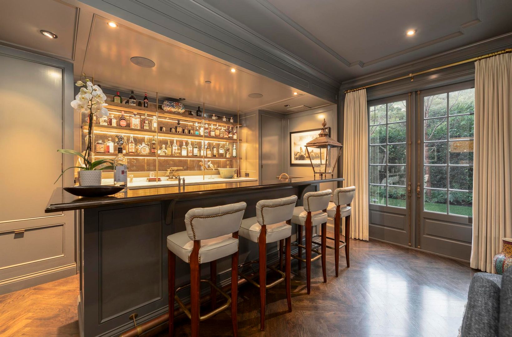 The home is offered fully furnished with high-end finishes and thoughtfully curated interiors. The main level features a chef’s kitchen equipped with premium Miele appliances, including three dishwashers and a built-in espresso machine. A grand formal living room with an oversized fireplace and expansive windows flows seamlessly into a full bar and screening room, along with a private office, dining area, and gym.