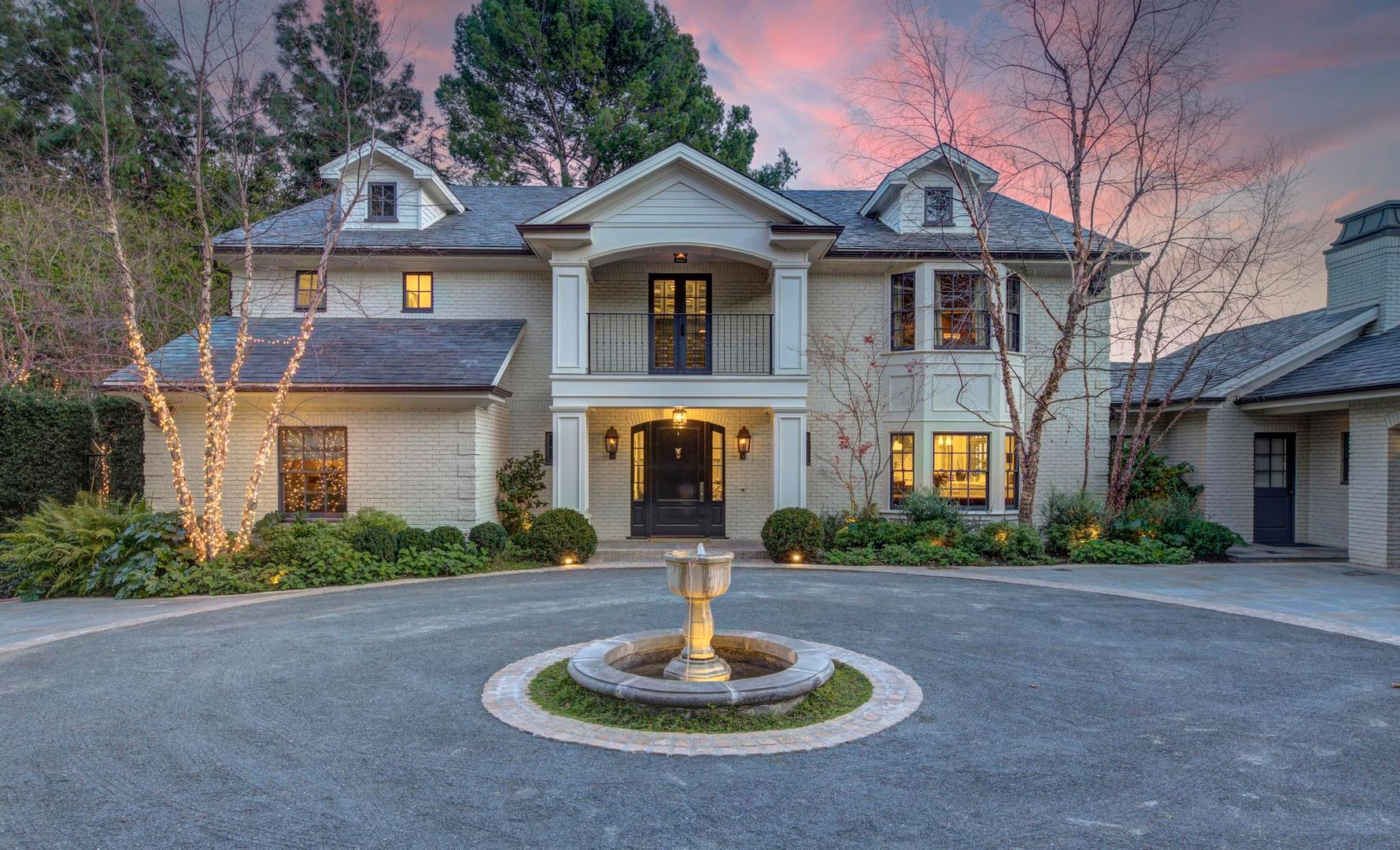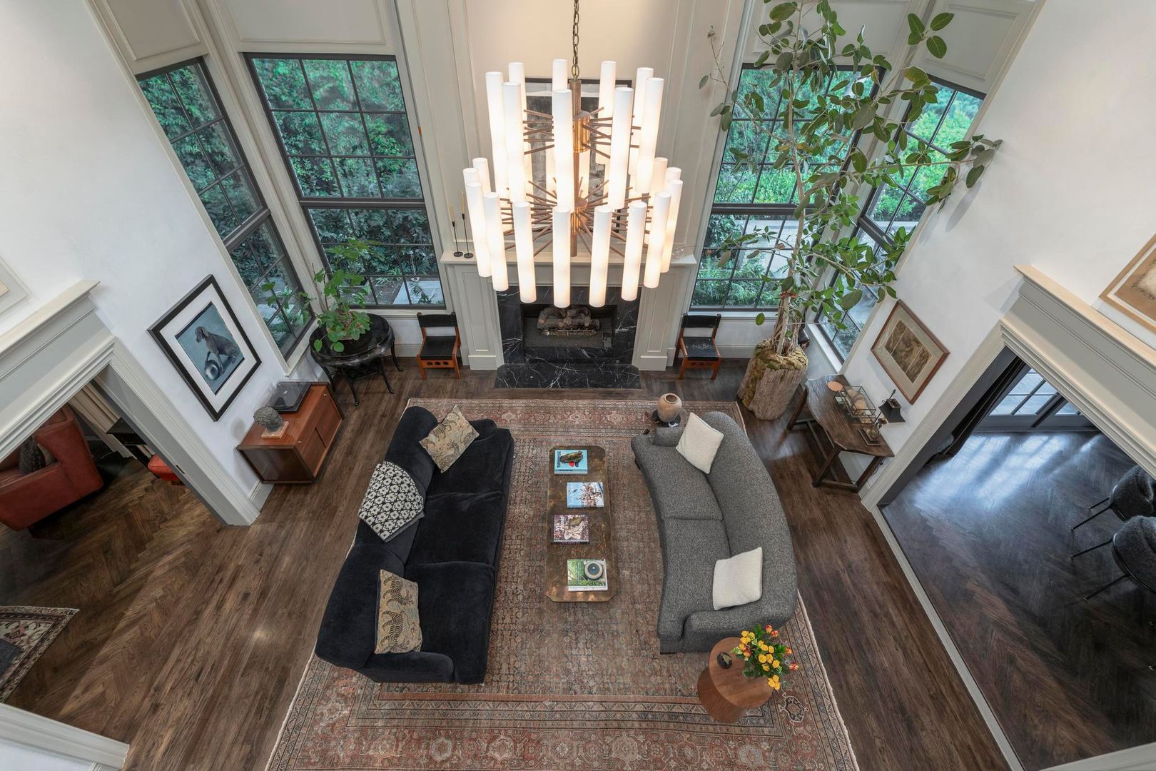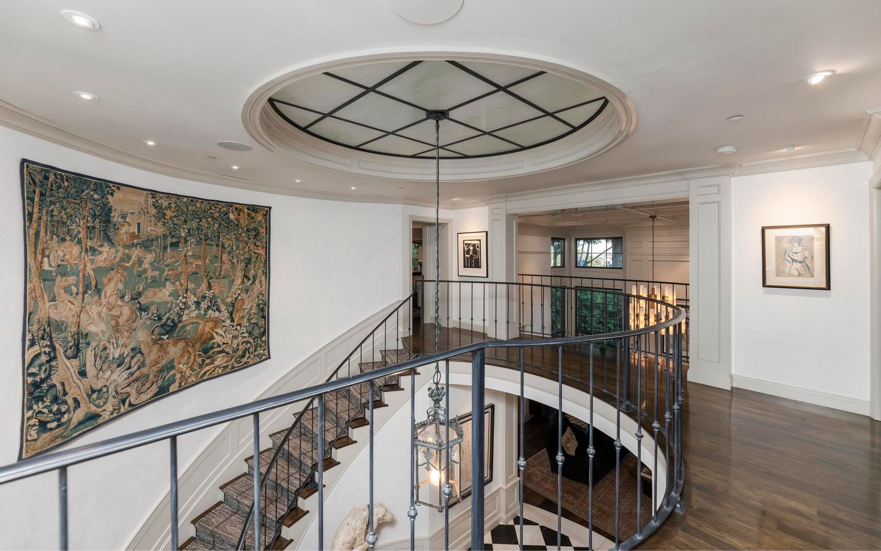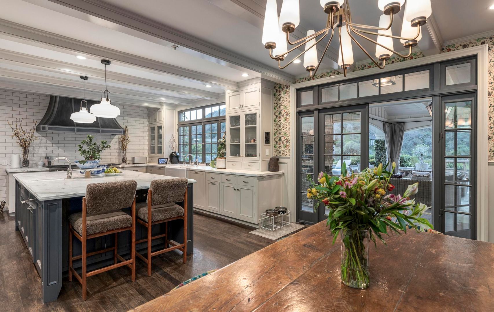 The home is offered fully furnished with high-end finishes and thoughtfully curated interiors. The main level features a chef’s kitchen equipped with premium Miele appliances, including three dishwashers and a built-in espresso machine. A grand formal living room with an oversized fireplace and expansive windows flows seamlessly into a full bar and screening room, along with a private office, dining area, and gym.
