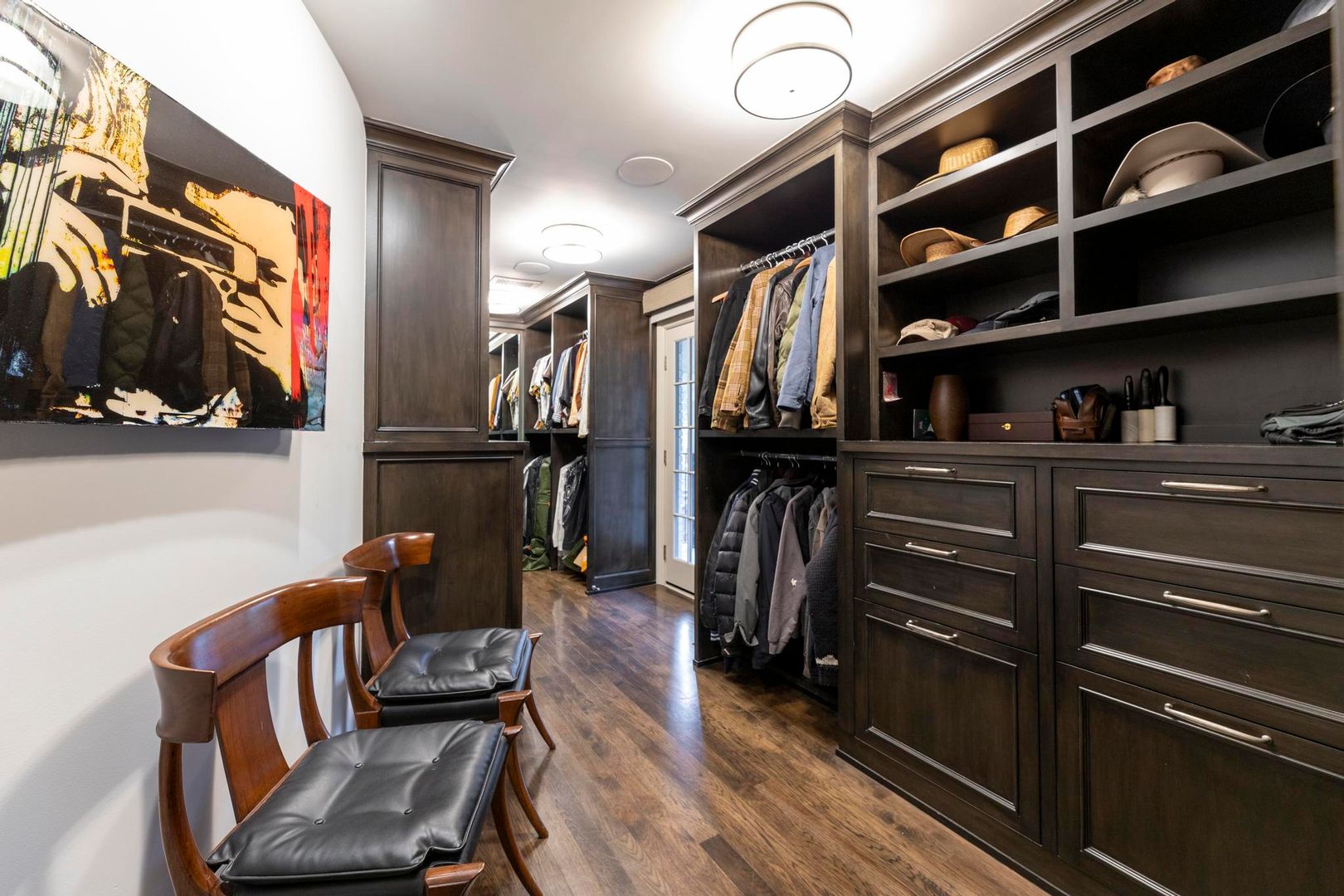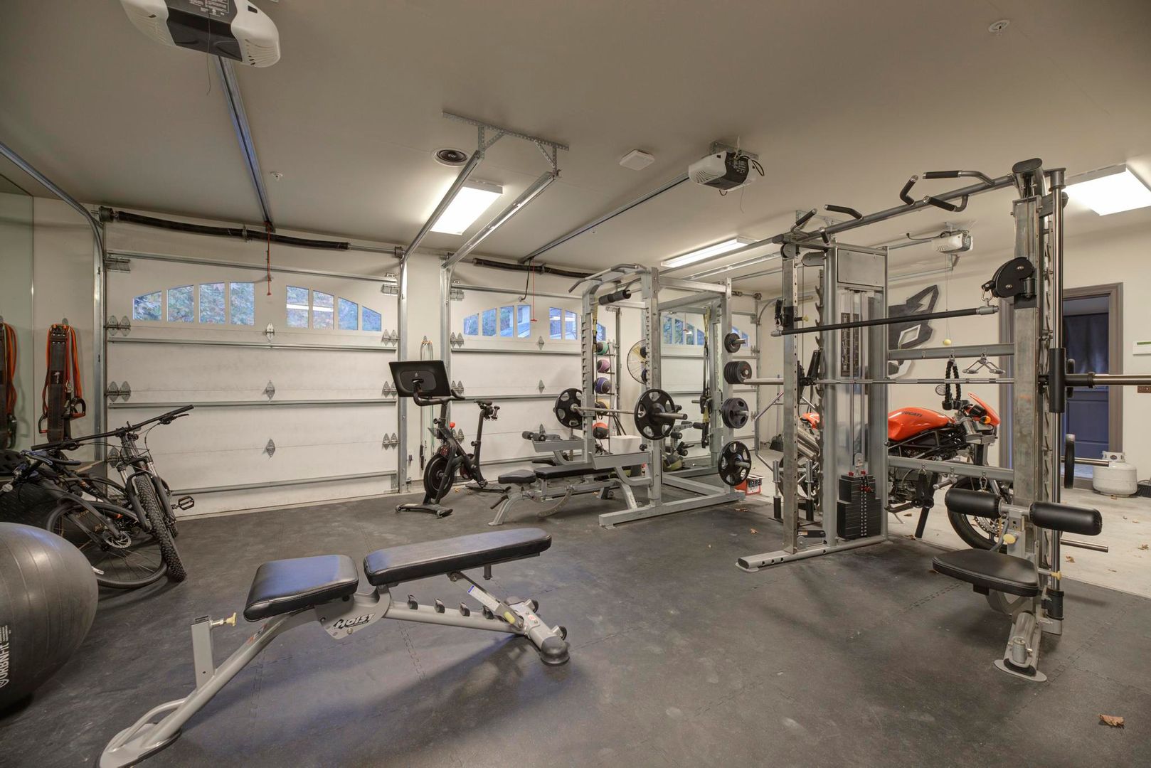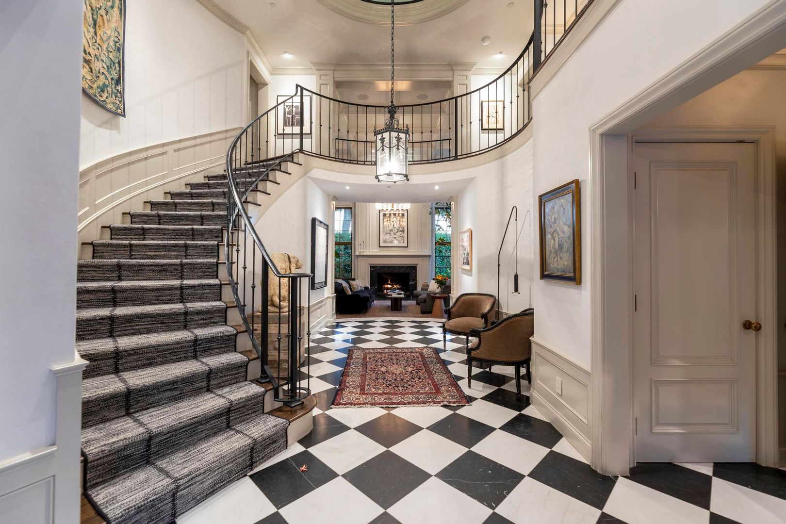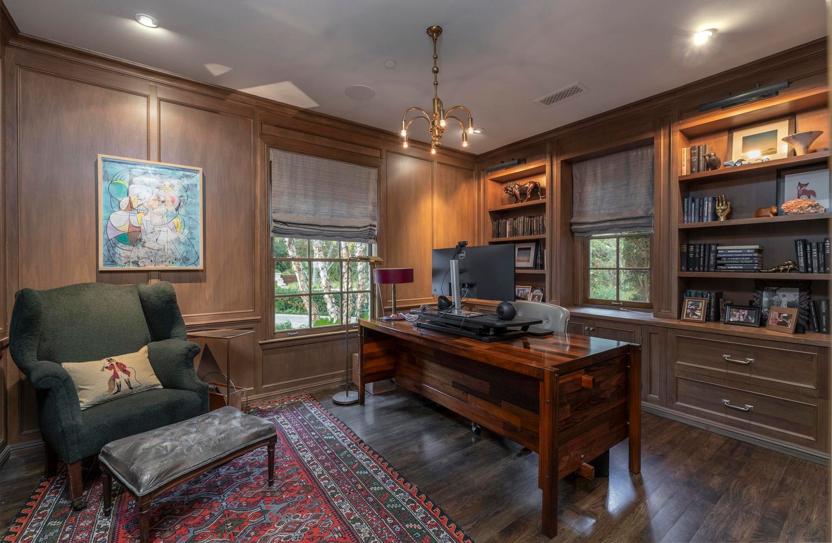 The home is offered fully furnished with high-end finishes and thoughtfully curated interiors. The main level features a chef’s kitchen equipped with premium Miele appliances, including three dishwashers and a built-in espresso machine. A grand formal living room with an oversized fireplace and expansive windows flows seamlessly into a full bar and screening room, along with a private office, dining area, and gym.