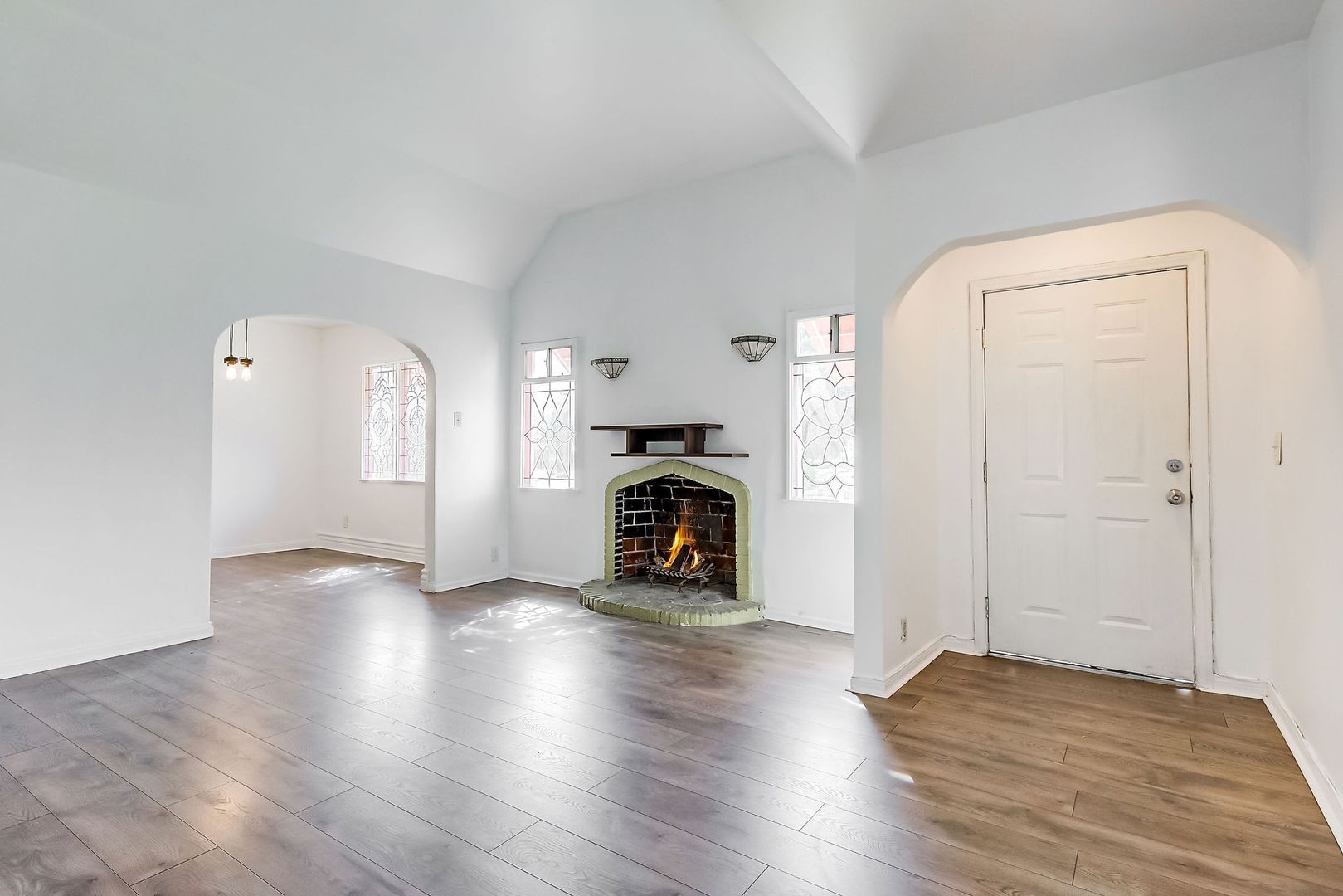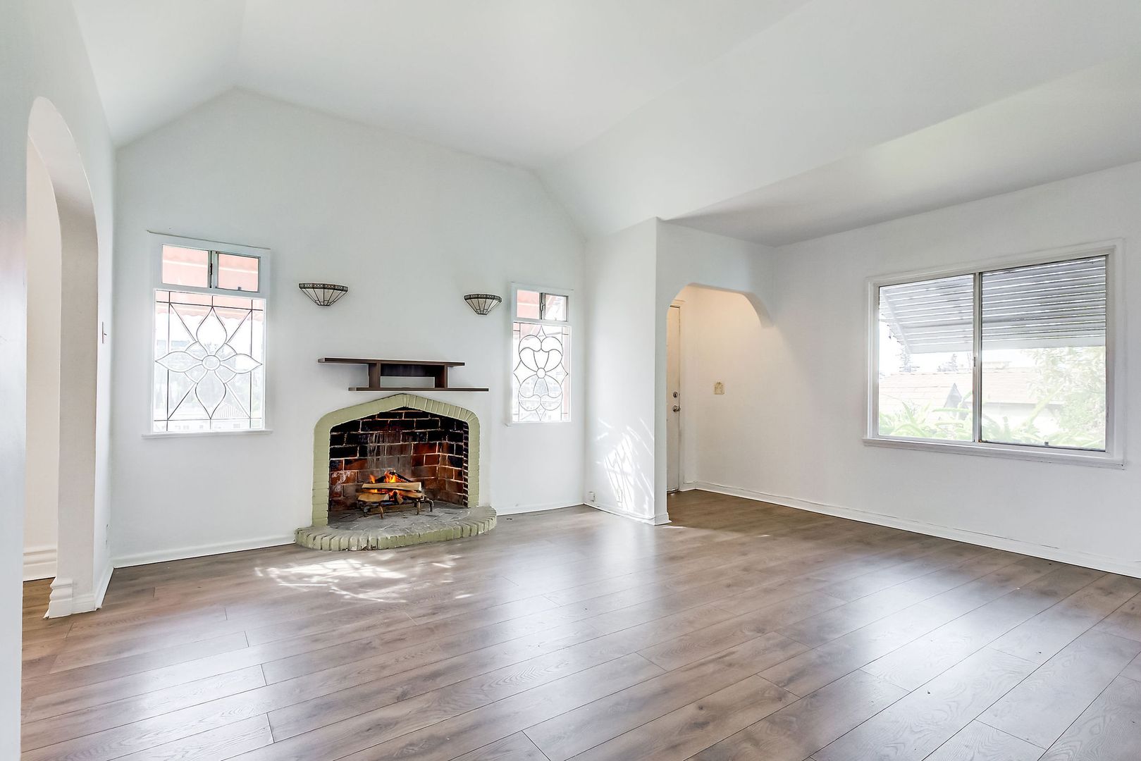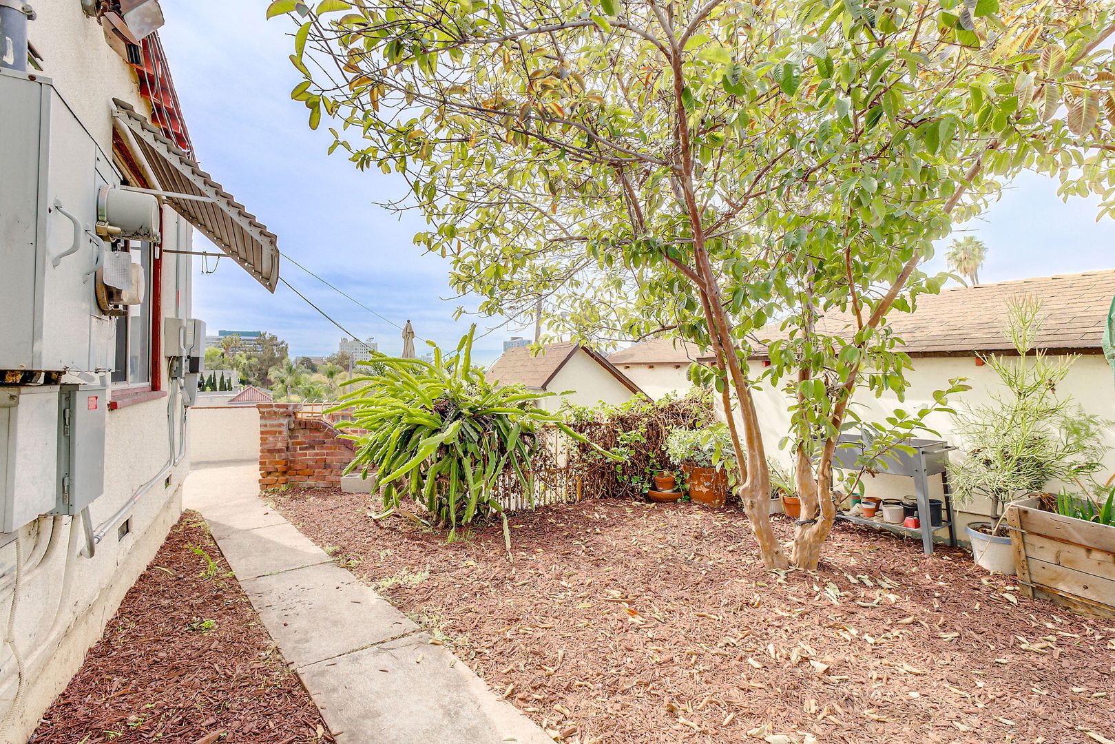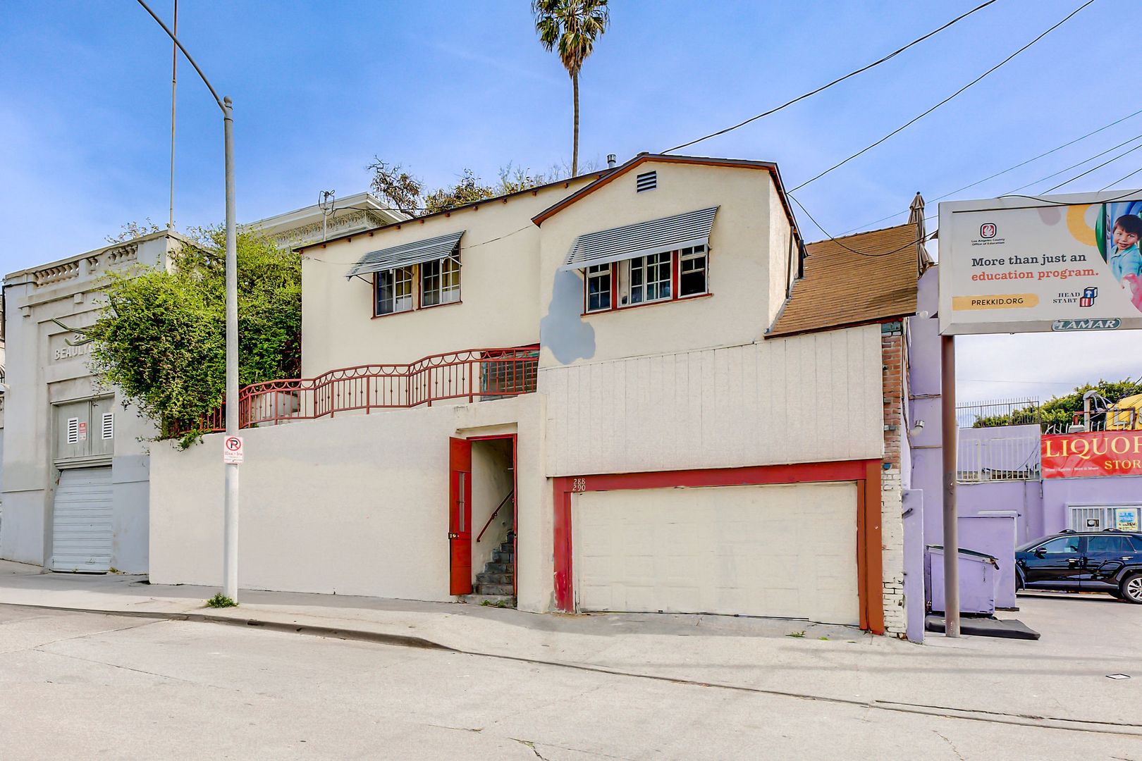 Step into your own storybook hideaway perched one level above the street! Ascend a gated staircase to discover a charming, private triplex — the centerpiece of which is a 2BR/2BA house brimming with original character: beveled glass windows, elegant archways, a decorative fireplace, and Art Deco light fixtures.