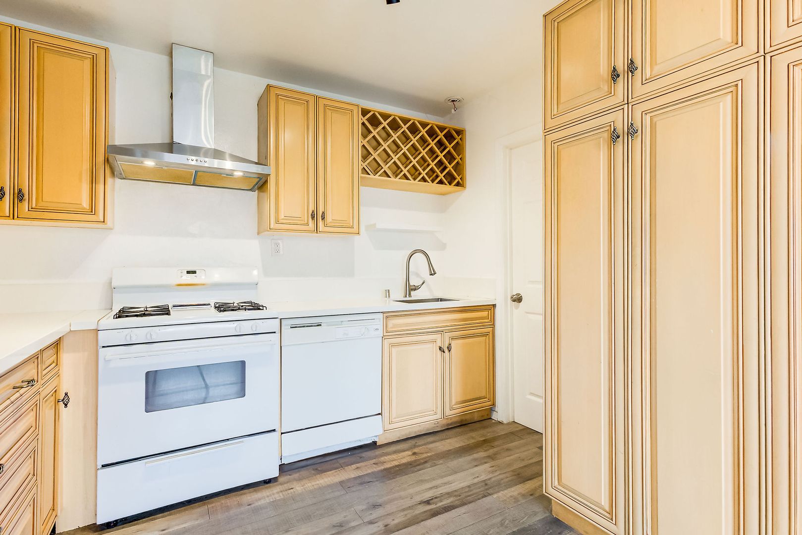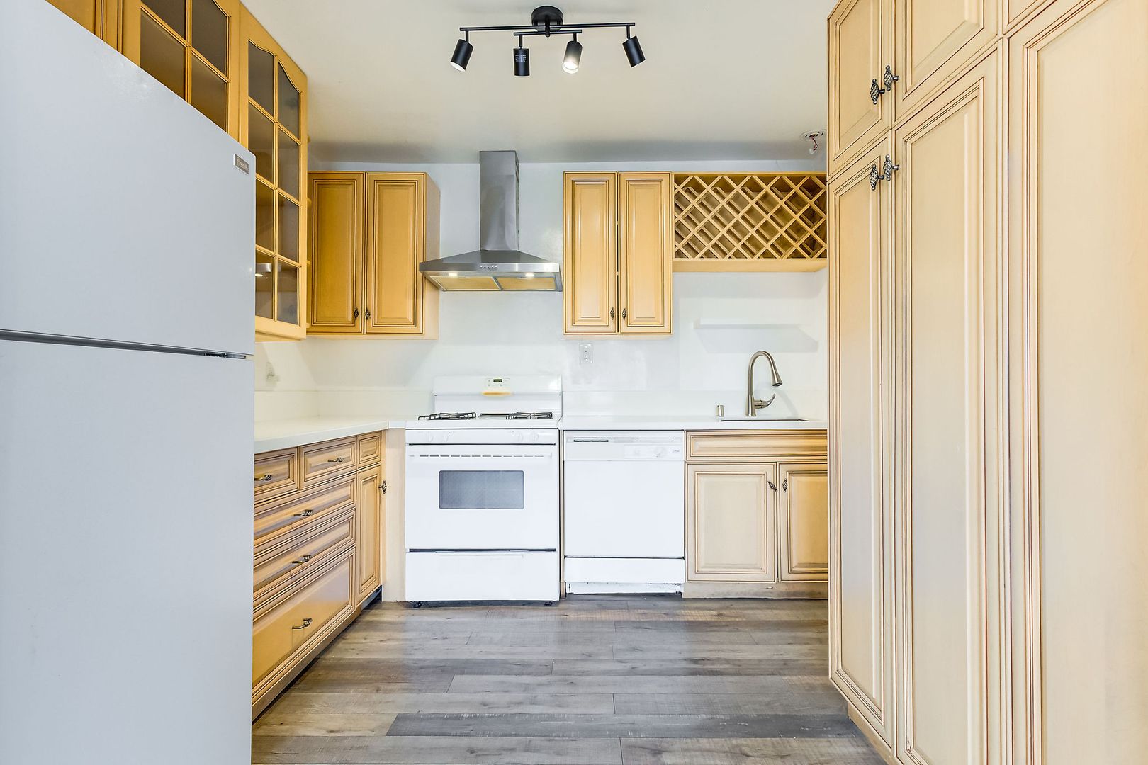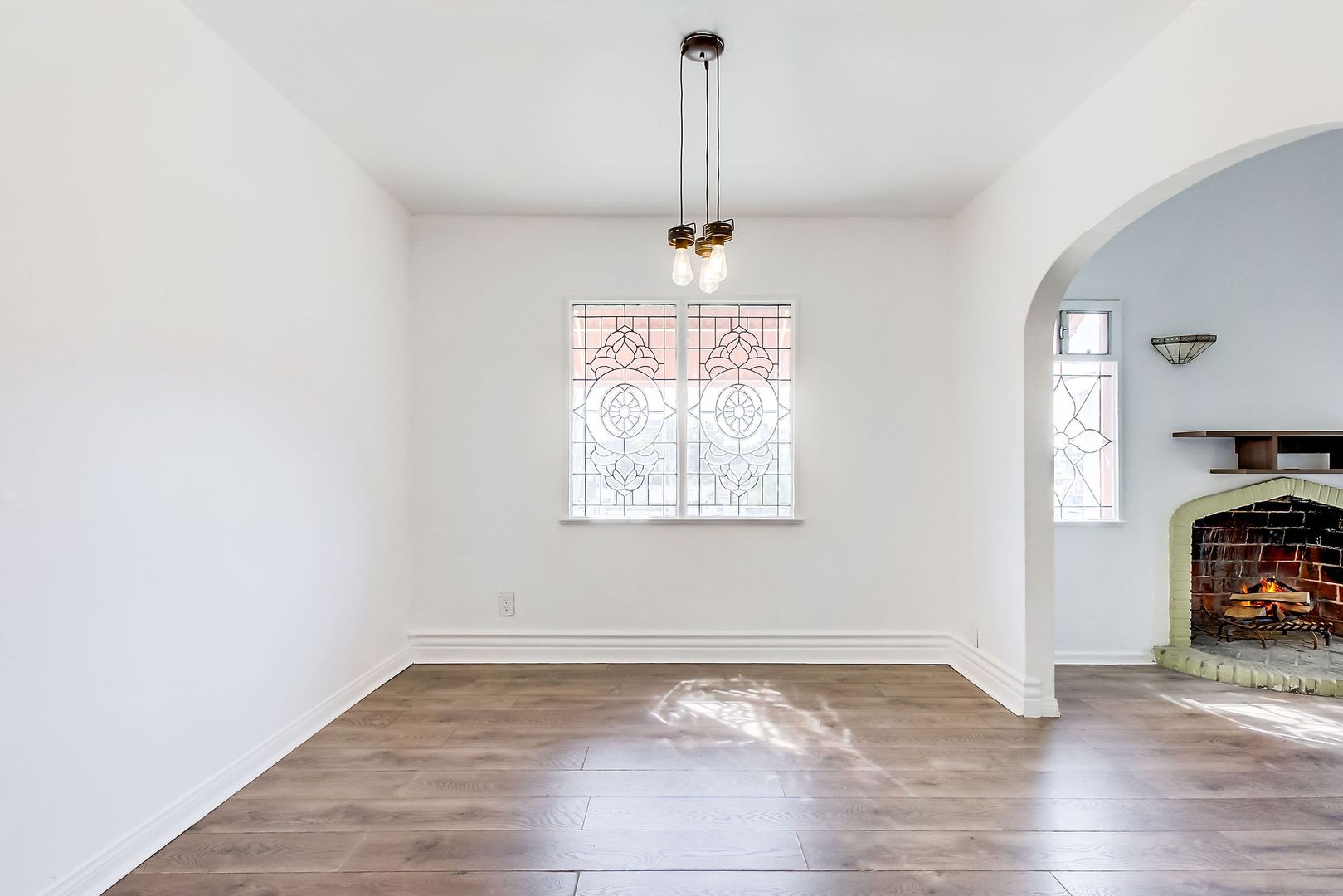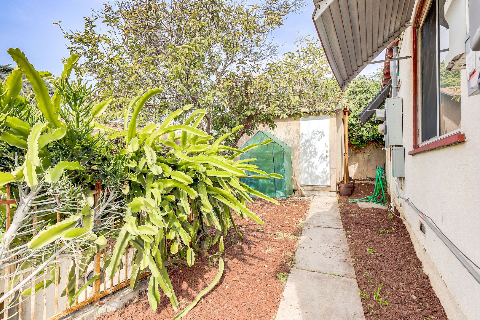 Step into your own storybook hideaway perched one level above the street! Ascend a gated staircase to discover a charming, private triplex — the centerpiece of which is a 2BR/2BA house brimming with original character: beveled glass windows, elegant archways, a decorative fireplace, and Art Deco light fixtures.